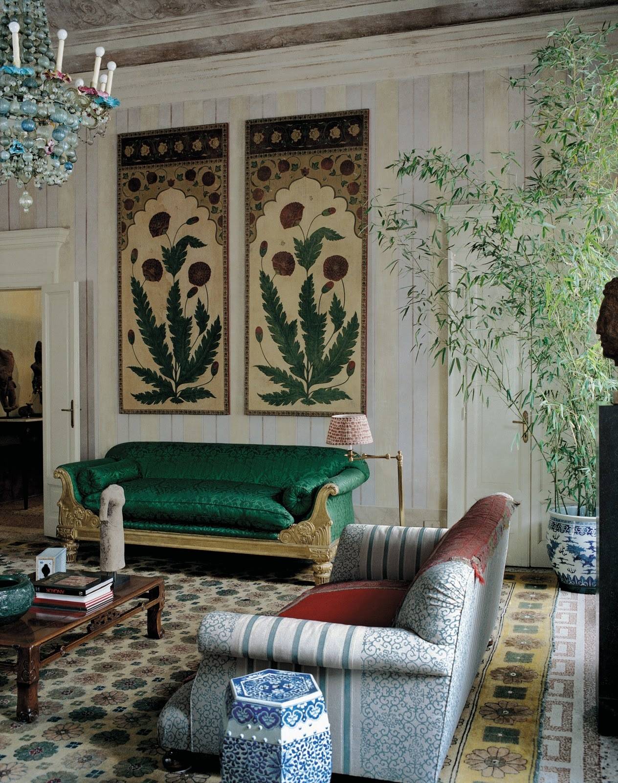 На индийских коврах изображены пышные растения, сцены охоты и пейзажи. Мебель включает фигурные элементы и ручную резьбу. Главное достояние стиля – это комфорт и иллюзия вечного праздника. Важными элементами являются бра, подсвечники, занавеси с индийским рисунком, цветные панно на стенах.