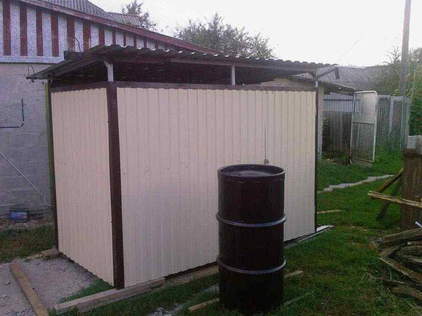 Каркас из профильной трубы, стены – профнастил, шторка для входа.