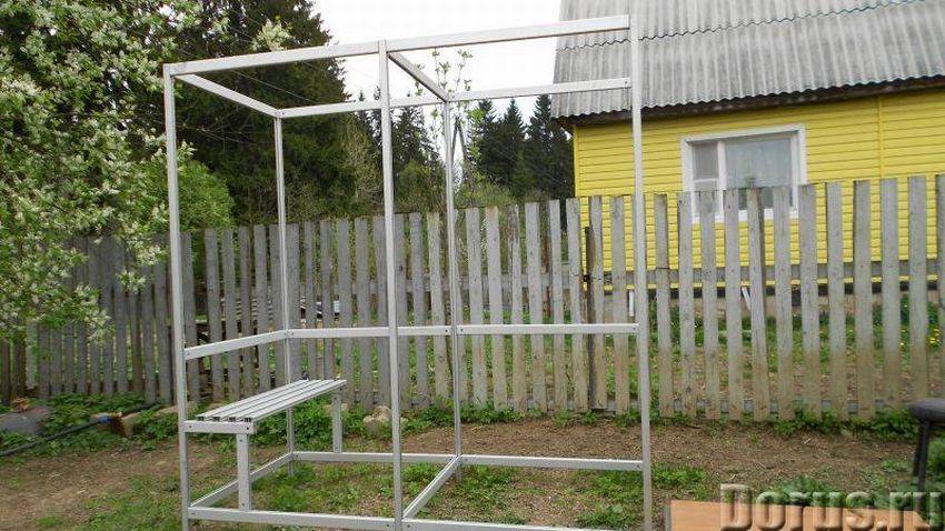 Сооружение каркасной кабинки из профильной трубы с внутренней скамеечкой.