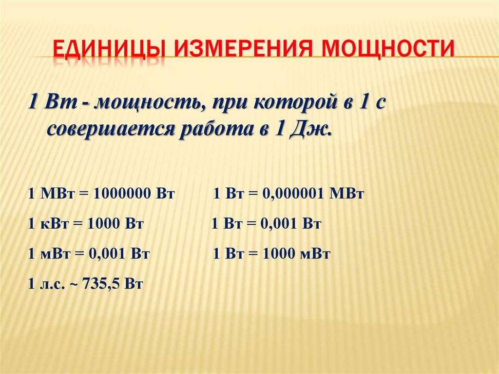 Ватты — это производные единицы. Это значит, что значения выражаются с помощью основных системных единиц. Один Вт — это мощность работы одного джоуля за одну секунду. Значит, мощность выглядит так: