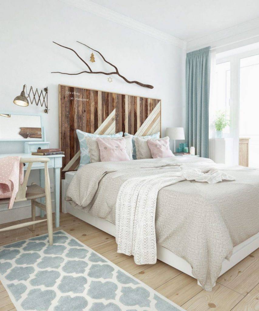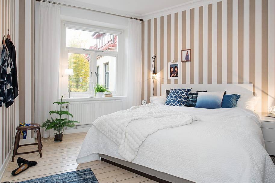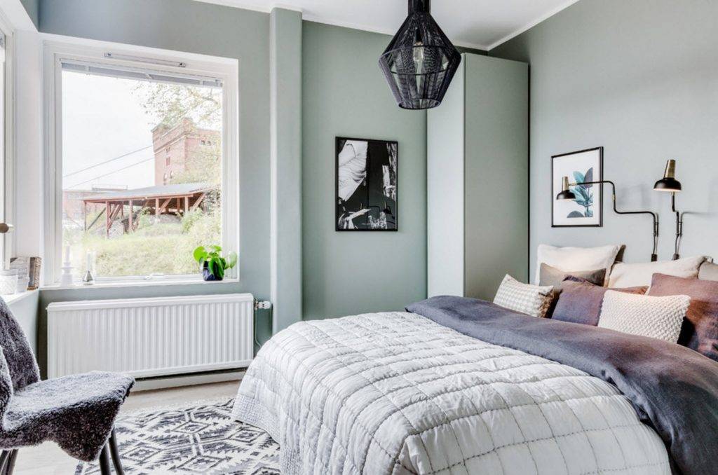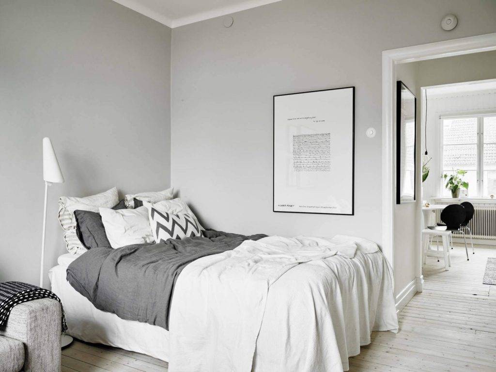 Простой текстиль, тюль на окнах, минималистичные светильники – это всё о скандинавском стиле. Кровать должна быть достаточно массивной, но простых форм. Расположите на ней побольше подушек и постелите тёплый плед.