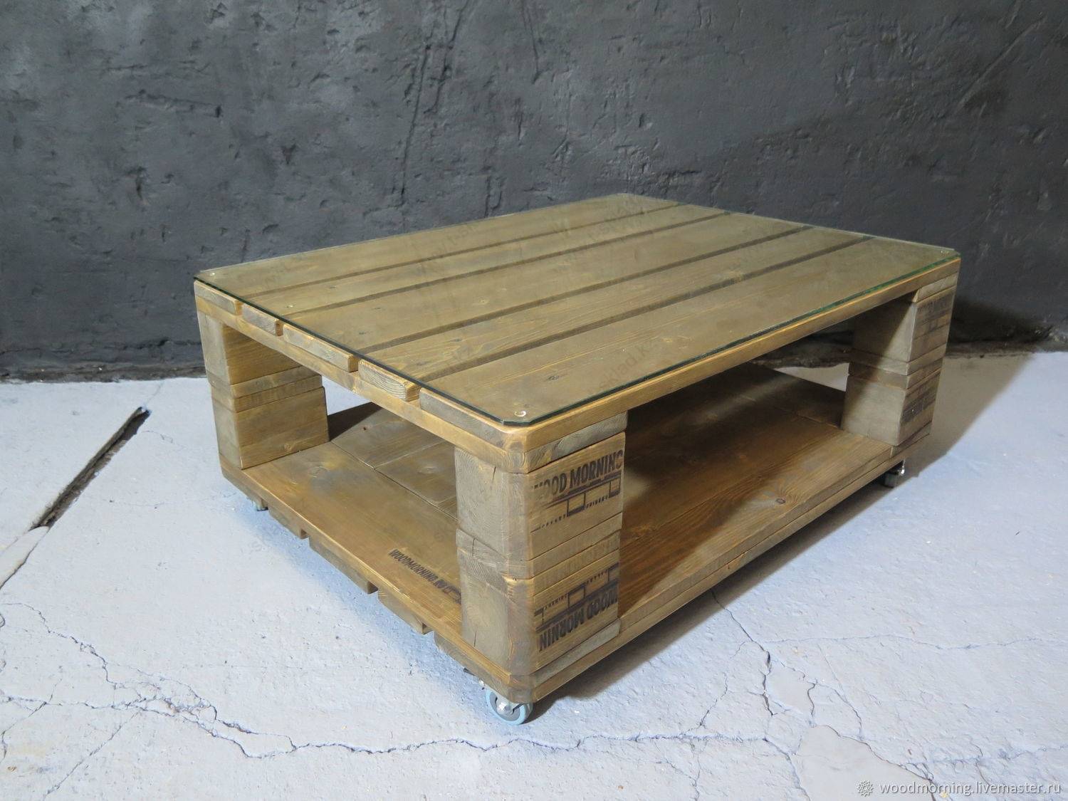 Самый простой вариант – это столик на колесиках высотой в два паллета. От поддона отрезается лишняя секция (перед кубическими ножками в середине поддона), если размер целого поддона (120 *80 см) слишком велик. Заготовки шлифуются, затем с помощью саморезов скручиваются друг с другом. На дно стола прикручиваются колесики. Стол покрывается лаком или краской нужного цвета.