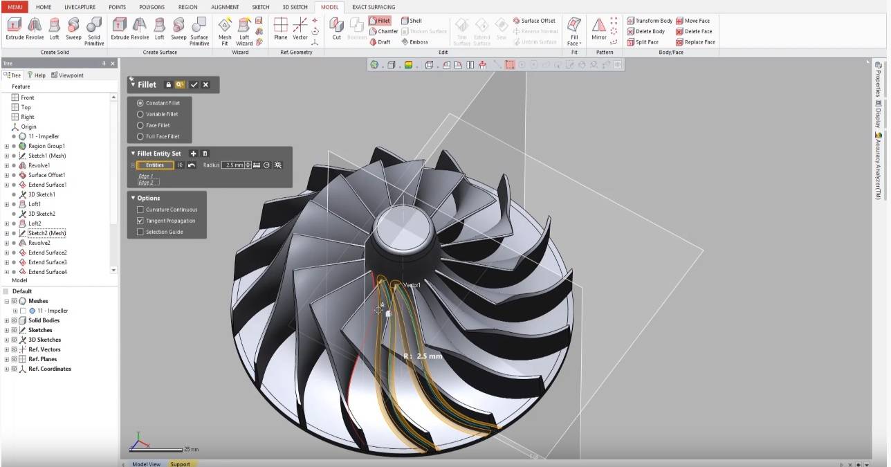 Приведем пример построения твердотельной модели крыльчатки в Geomagic Design X. Поверхность крыльчатки ограничена некой параметрической поверхностью. Ее можно получить, во-первых, автоматическим подгоном по сетке параметрической поверхности – такая функция есть в Design X.