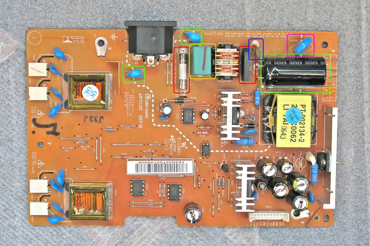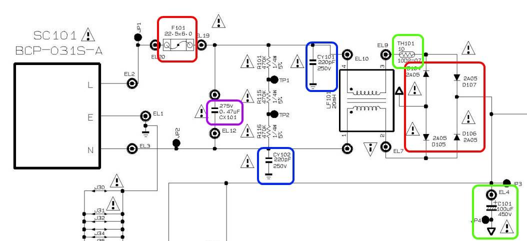 Итак давайте по схеме посмотрим, какие радиодетали у нас могут коротнуть. На фото выделены цветными рамками те детали, которые необходимо будет проверить при коротком замыкании в высоковольтной части