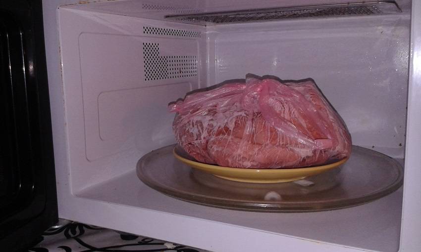 Мы привыкли размораживать мясо в микрволновке. Это очень быстро и удобно. Однако нужно понимать, что данный продукт сырой, а под воздействием микроволн, вредные бактерии получают очень быстрое развитие. Вы наверное замечали, что края такого мяса после разморозки в микроволновой печи становятся серыми. Такое ощущение, как будто данная часть куска уже сварилась. В реале же, она просто пропала. Употреблять в пищу, такой продукт не стоит. Лучше оставить замороженное мясо на ночь при комнатной температуре или положить на нижнюю полку холодильника.