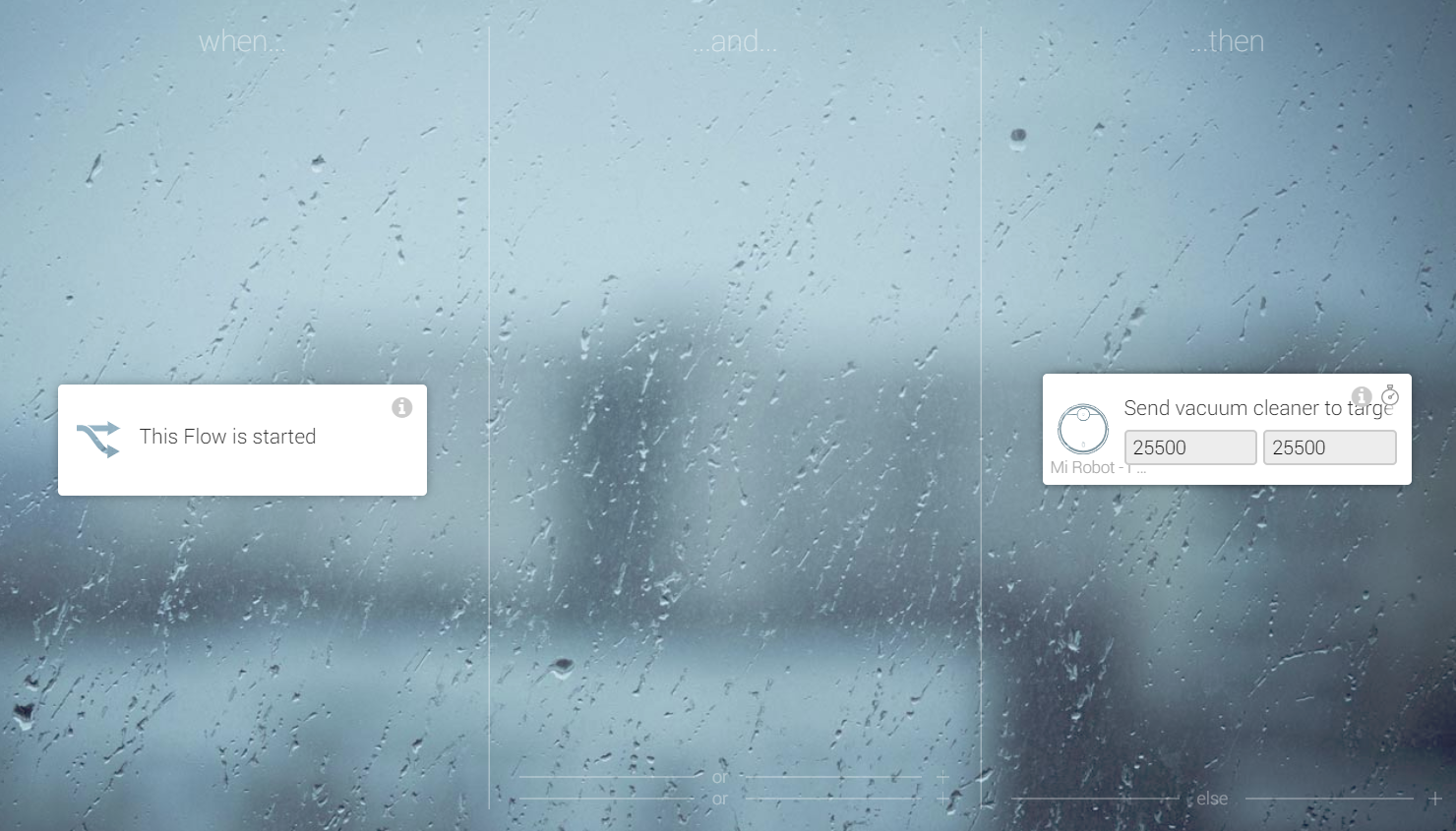 - Затем создают Flow. Столбец «When» будет отвечать за информацию процесса активации виртуальной кнопки. Столбец «Then» будет выполнять роль карточки пылесоса, в которой указано действие «Start zone cleaning».