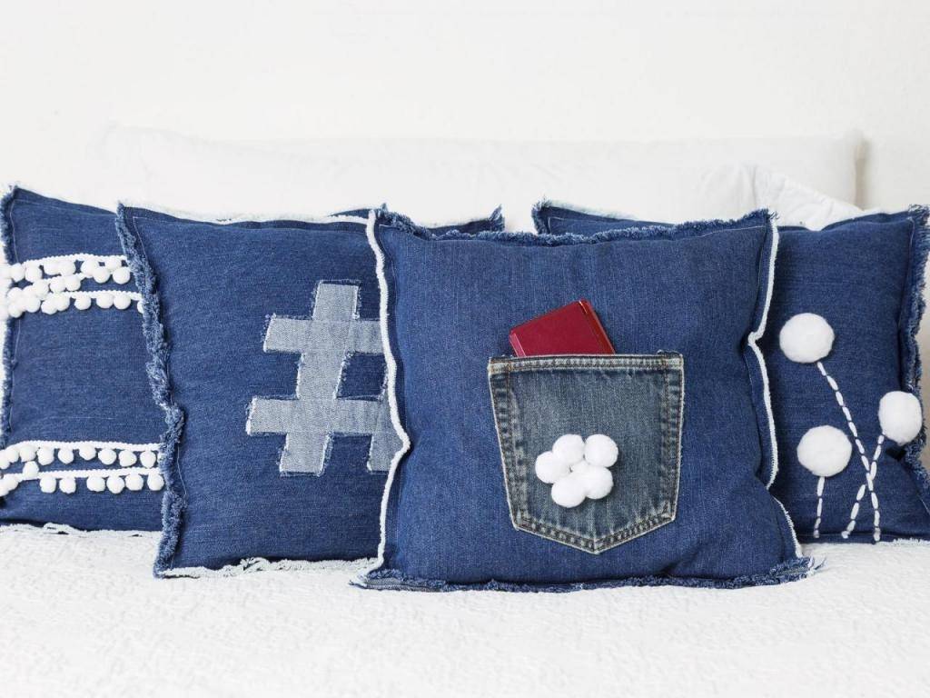 Помимо стандартных вариантов джинсовой подушки, можно выдумать еще много креативных идей: