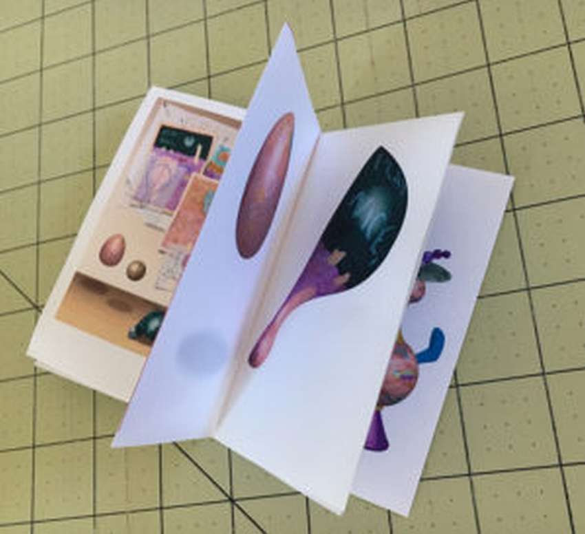 Держите бумагу сложенной пополам, но сожмите стороны вместе , чтобы открыть центральную часть, там, где вырезаны отверстия.