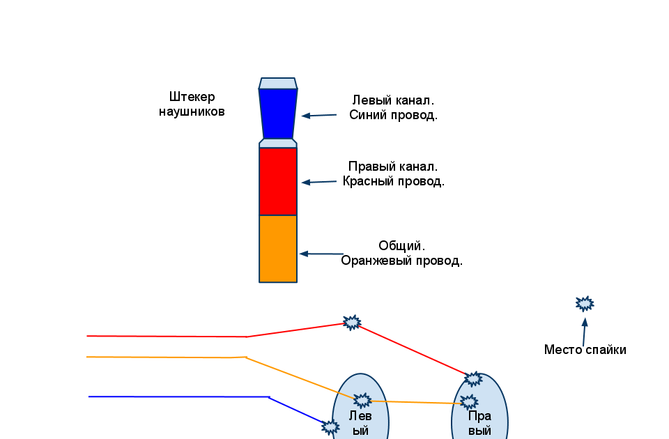 Если наушники таких устройств выйдут из строя, можно обрезать кабель наушника, приобрести новую гарнитуру, и произвести монтаж новых наушников в соответствии со схемой.