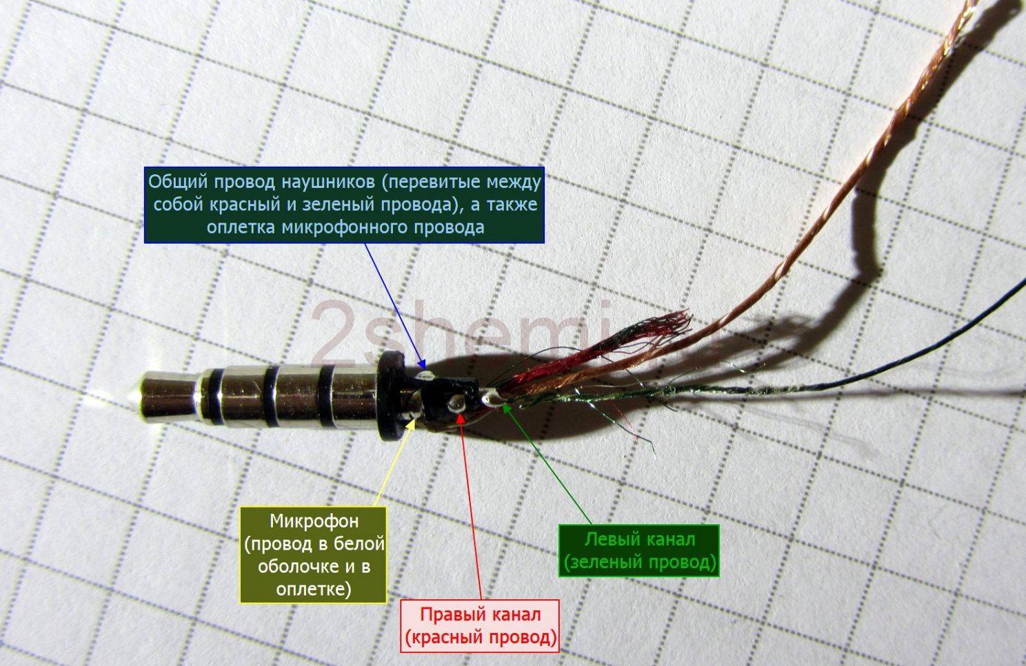 О том, как запаять 4 провода от наушников к штекеру вы должны сразу понять из рисунка: А вот как припаять наушники к такому джеку: Вариант второй: у вас полноценная гарнитура то есть наушнки с микрофоном и на штекере 4 контакта. Распайка наушников с микрофоном и кнопкой: пошагово После того, как выявлена причина неисправности, и приготовлены необходимые инструменты и элементы, можно приступать к распайке: Острым ножом следует срезать старый разъем, оставляя от основания примерно 0, см.