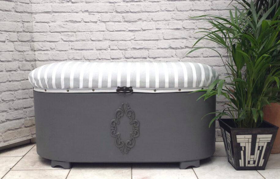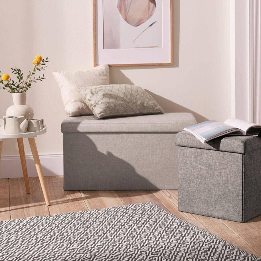 - Пуфик-корзина. Главный плюс — практичность. Сиденье снимается, чтобы внутрь можно было сложить вещи: обувь, средства для ухода, зонты и др. Хорошая альтернатива стандартной обувнице.