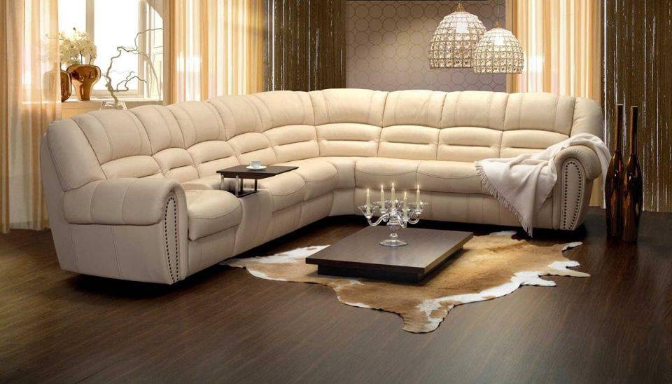 Такой вид дивана, как угловой, имеет самые большие габариты в связи со своей формой и подойдёт лишь для просторного помещения.