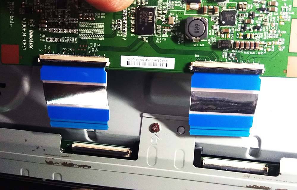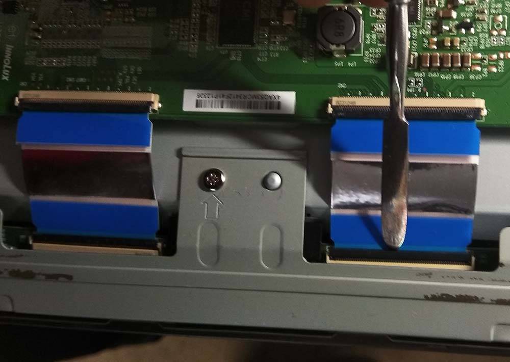Сначала, отключил шлейфы идущие на плату T-CON и MAIN плату, после чего отвинтил и снял эти платы.