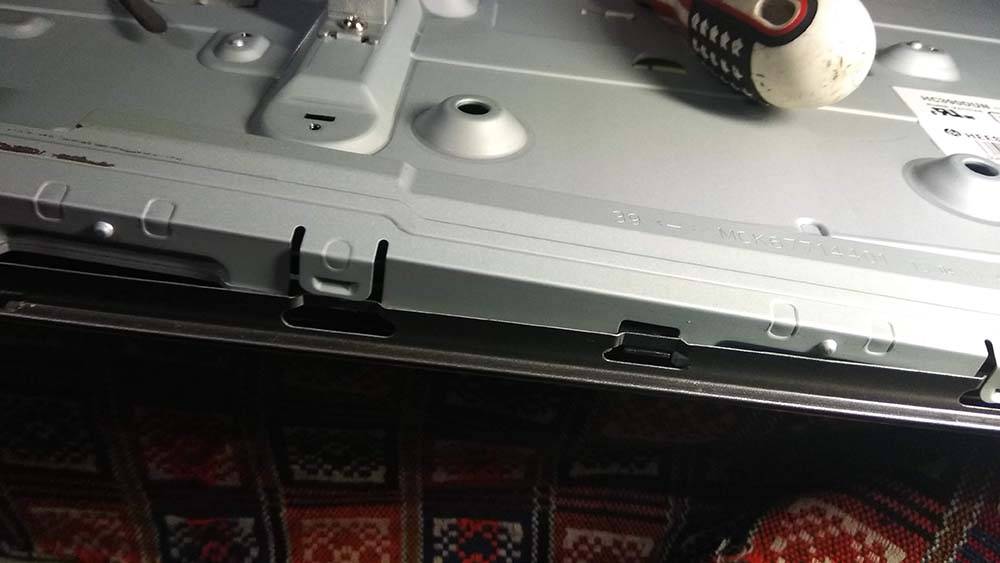 Помимо задней крышки, необходимо и снять переднюю раму. Для этого достаточно просто открутить болты, по всем ее сторонам. Положив ТВ на заднюю стенку, вы легко снимете раму