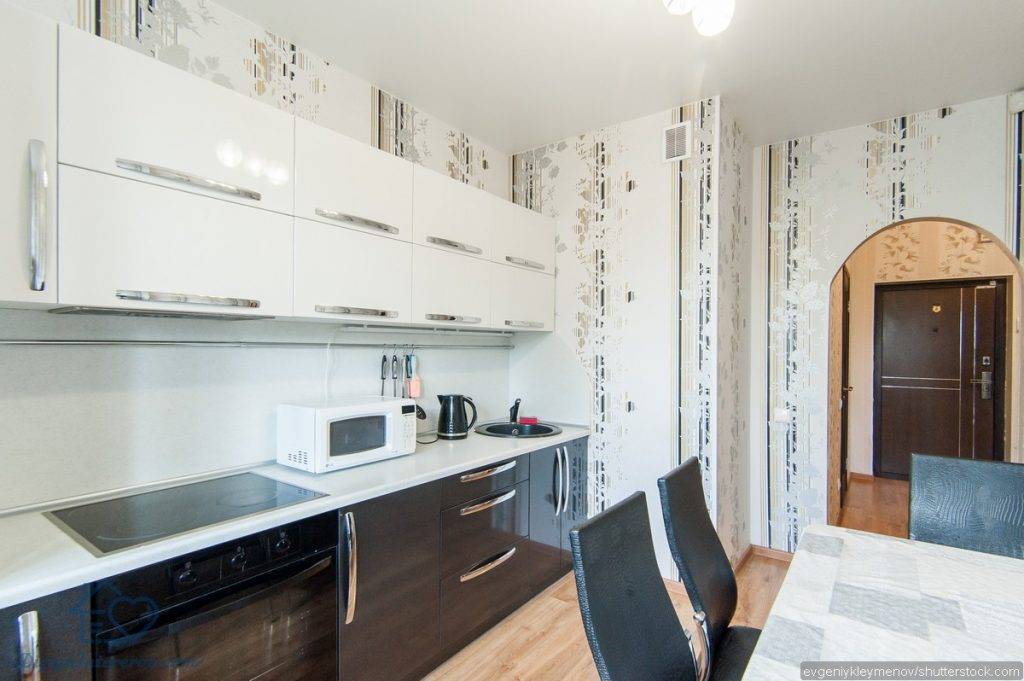 Черные и темные цвета лучше избегать в маленькой кухне или допускать в самых минимальных значениях. Например, белые обои кухни могут содержать декор из тонкого темного кружева — это сделает стены более объемными.