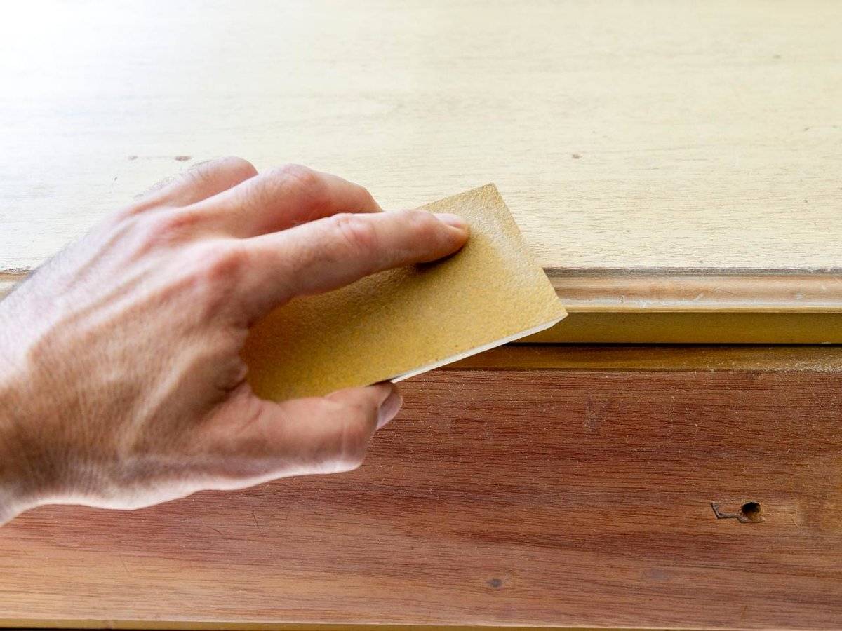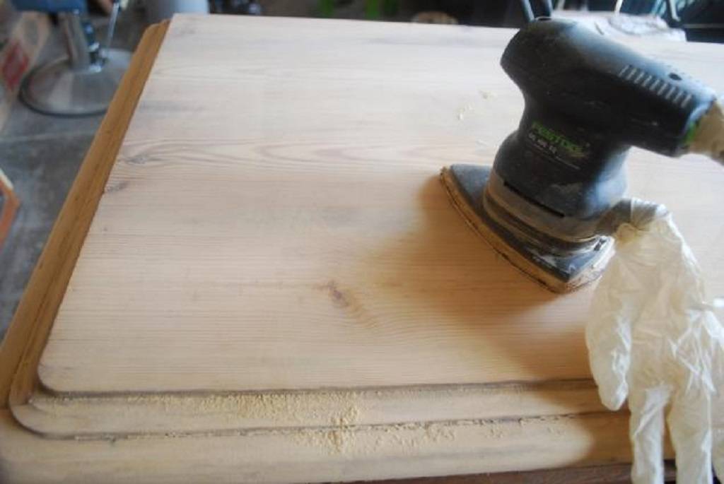 Далее снимают старый слой покрытия, избавляются от вздутых мест – снимают, при необходимости, верхний слой дерева. Неровности на деревянных поверхностях устраняют электрорубанком. Иногда приходится использовать посторонние предметы чтобы избавиться от пыли, забившейся в щели – старой зубной щеткой. Ручки откручивают, не подлежащие реставрации заменяют новой фурнитурой. Затем моют, дают высохнуть, покрывают грунтовкой. Если материал не дерево, то шпатлевкой.