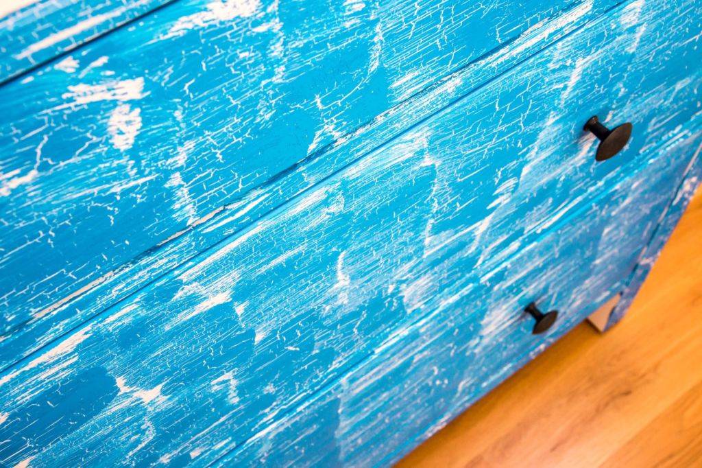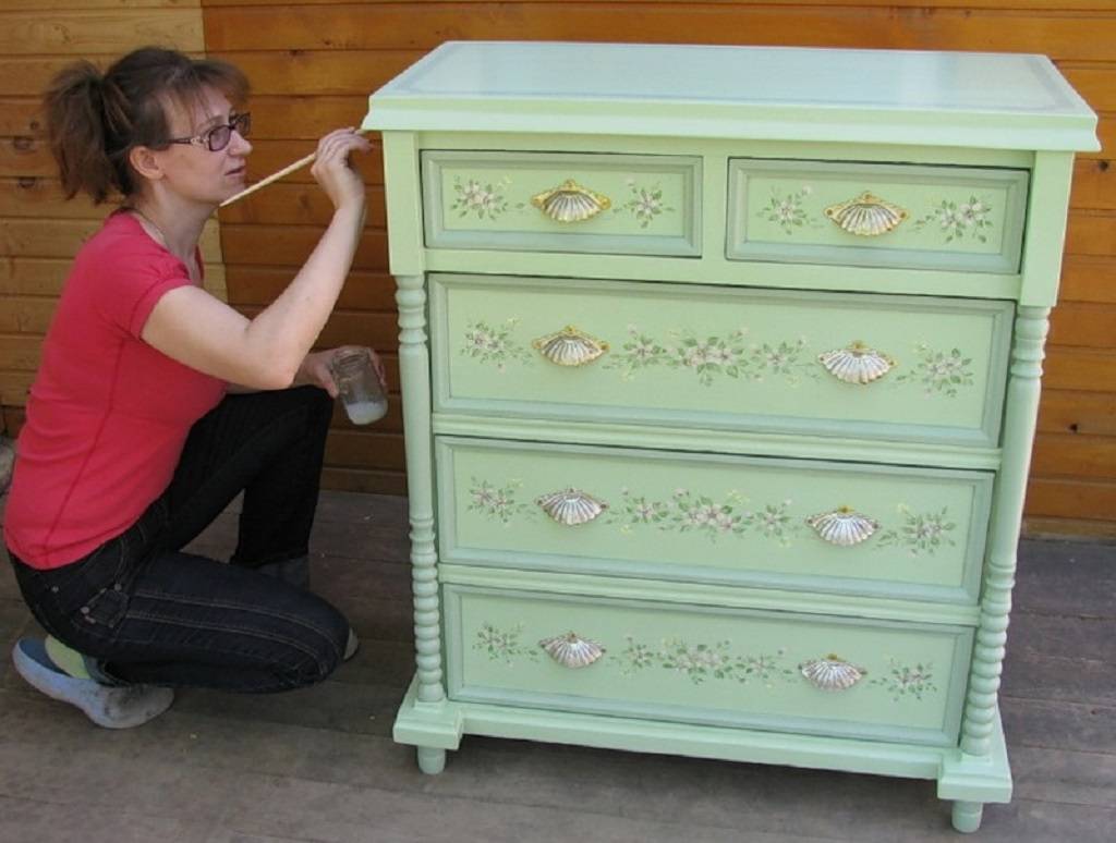 Покраску акриловыми враиантами проводят несколько раз. После высыхания слоев, покрывают лаком. Лак низкого качества имеет короткий срок годности. Комод потрескается вне зависимости от того попадают на него солнечные лучи или нет.