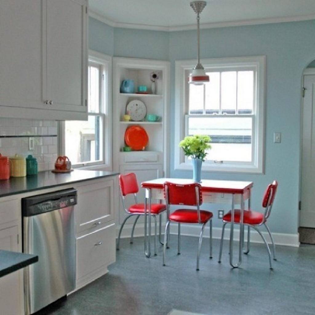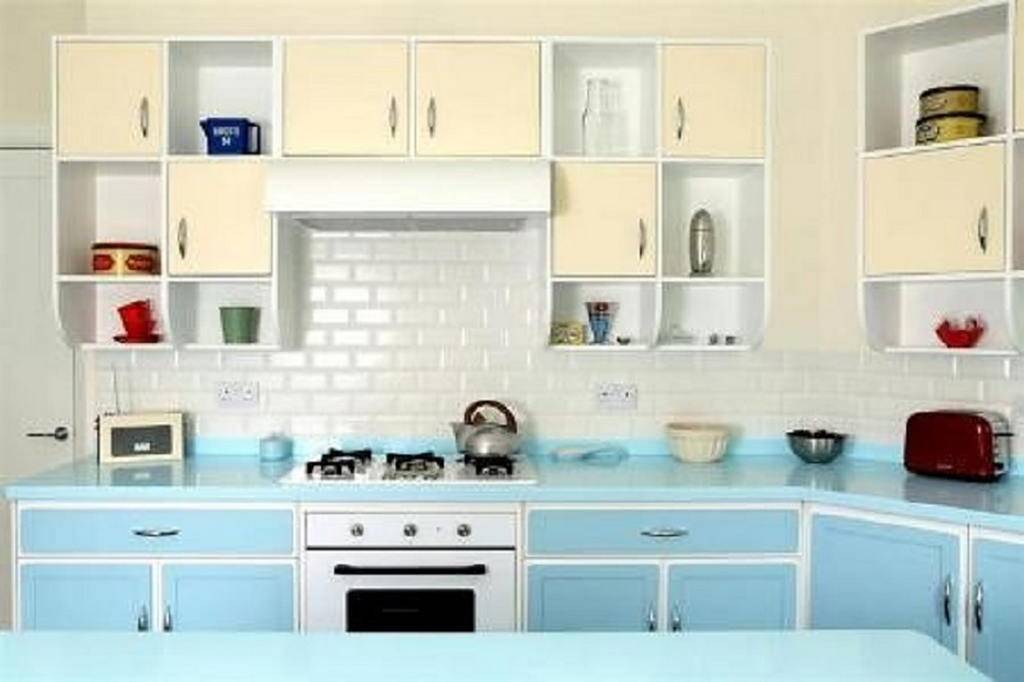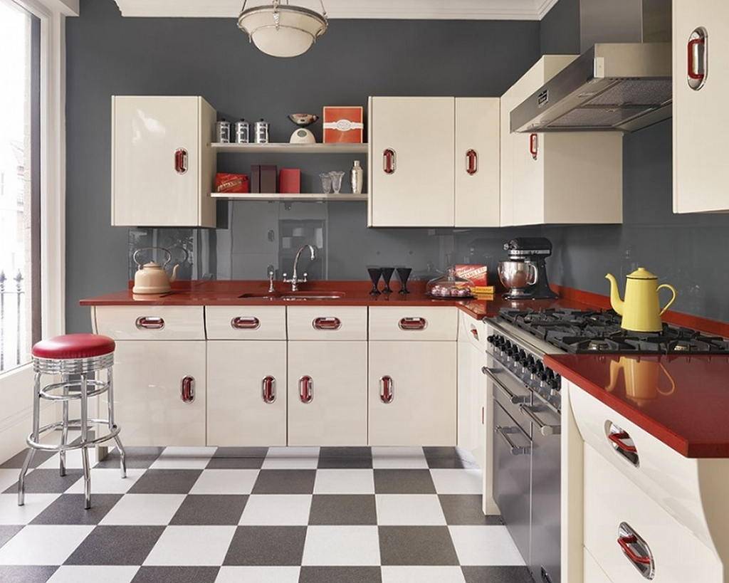 В 50-х годах главным украшением кухни становится габаритный холодильник, выкрашенный в лимонный, бледно-розовый, мятный или иной цвет, ассоциирующийся с жевательной резинкой. Хром присутствует на приборах и смесителях, он же используется для декорирования мебели и столешниц. Легки и неприхотливы в уходе пластмассовые стулья ярких дневных цветов.