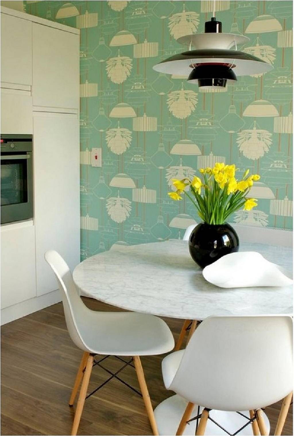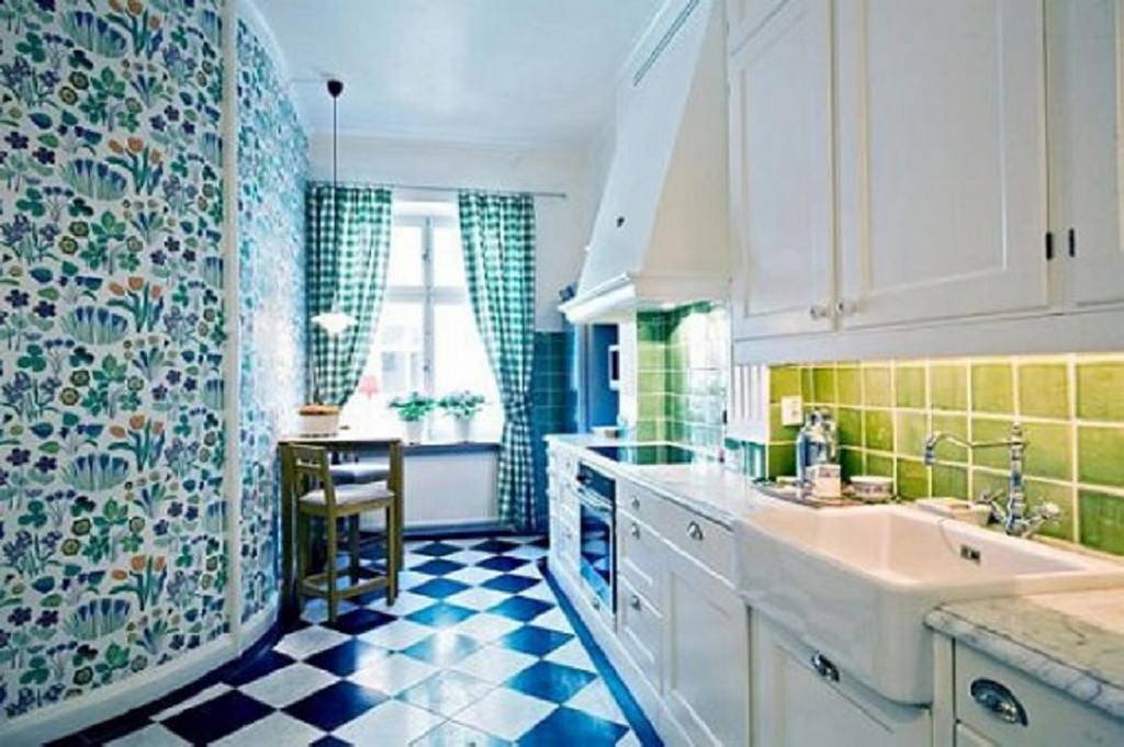 Стены (не все) оклеиваются винтажными обоями в цветочек, полоску, клетку или с гастрономическим рисунком (конфеты и фрукты, пирожные и чашки и др). Остальные стены (одна над фартуком или две) окрашиваются краской в тон обоям или диаметрально противоположный (светло-зеленый – желтый, голубой – красный и др). Допустимо оклеить все стены одинаковой клеенкой, которая предназначена для кухонных столов. Рисунок подойдет мелкий или крупный цветочный, или как для обоев.