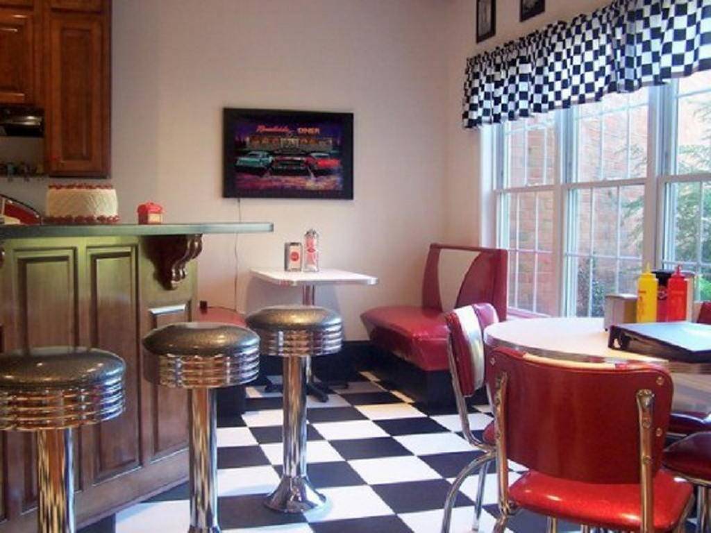 - Зато пластиковые предметы обстановки, в том числе, посуда и мебель, вполне вписываются в этот ретро-образ. Для того, чтобы добиться его усиления, можно воспользоваться портретами звезд кинематографа тех лет, или наклейками на стену, изображающих вещи в ретро-стиле. Например, автомобили, технику, одежду.