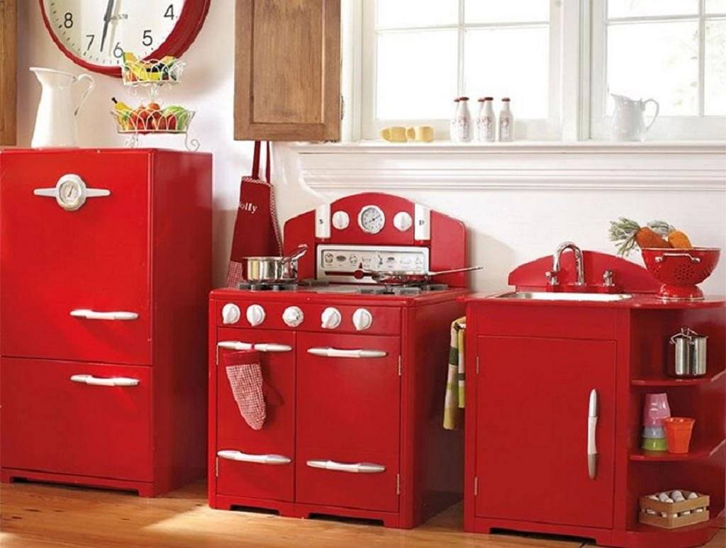 Хоть один предмет желательно на кухне разместить, например, холодильник. Его массивность, округлость и «пухлость» будет очень импонировать общему дизайнерскому направлению. Он может быть любого оттенка, кроме черного цвета. Холодильники, плиты, духовые шкафы в винтажном стиле выпускает фирма Bosch, Gorenje (коллекция Oldtimer), Smeg и ILVE.