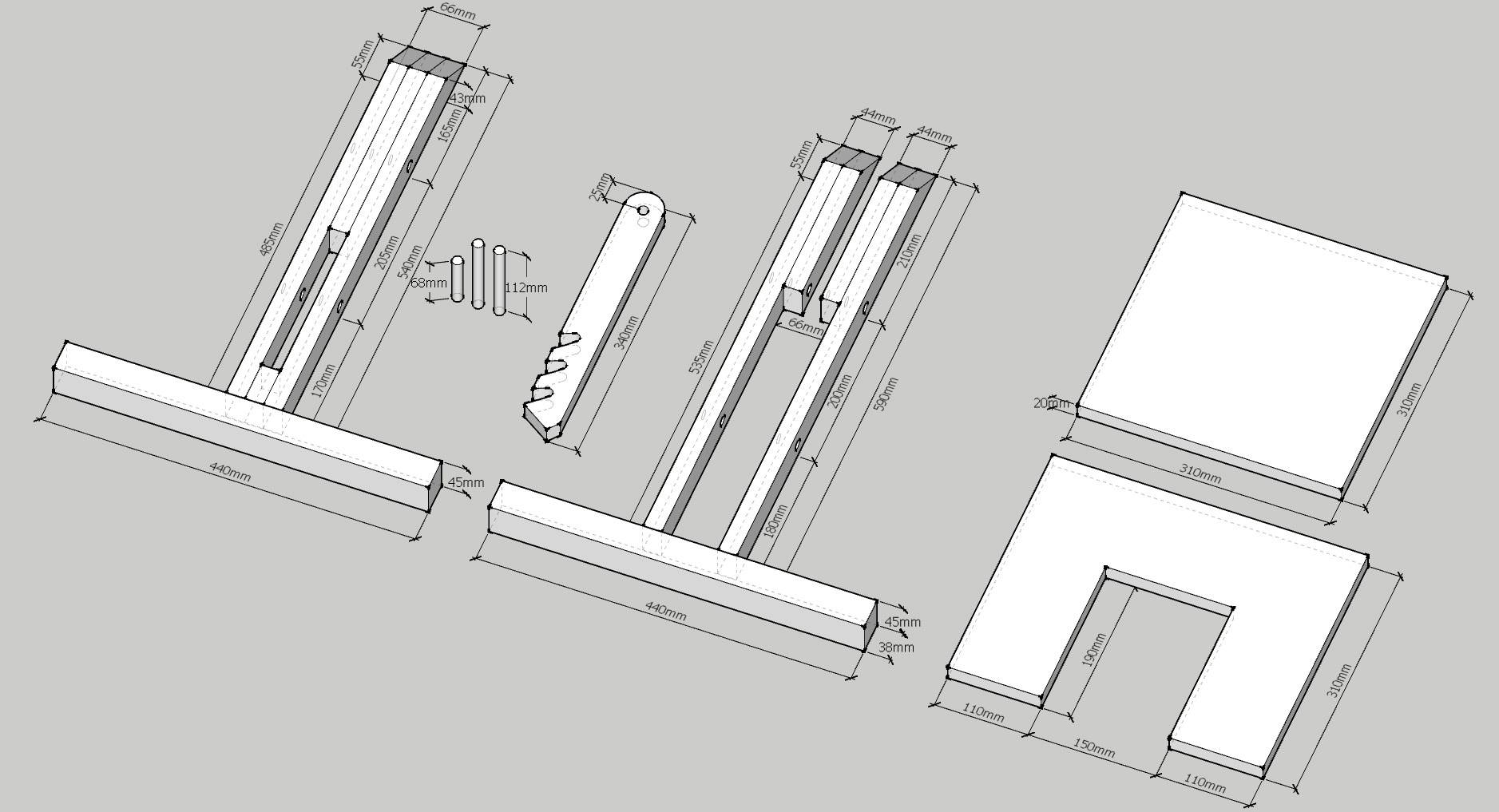 - Из брусков нарезаются все детали согласно чертежу. Вертикальные бруски: два передних и один задний. Горизонтальные: поперечные планки (горизонтальные ножки). Деталь с пазами для регулировки высоты.