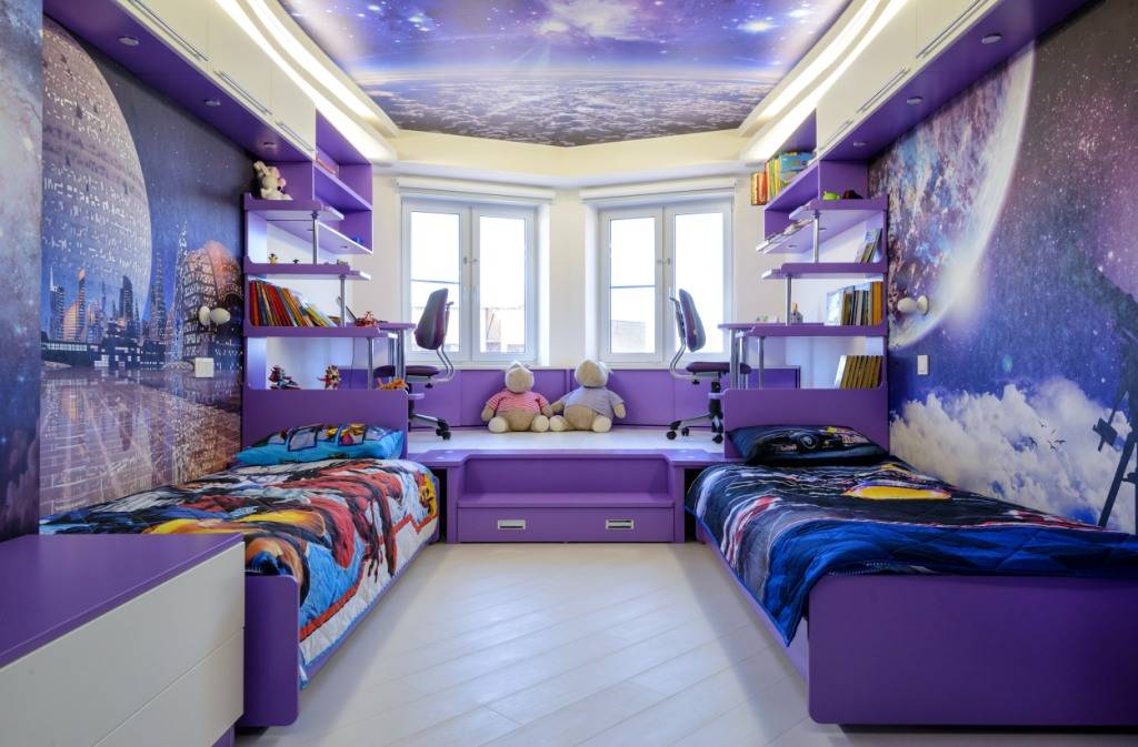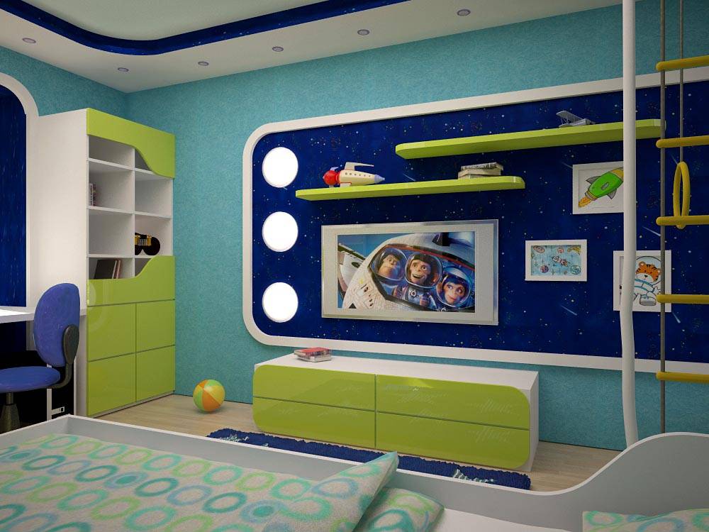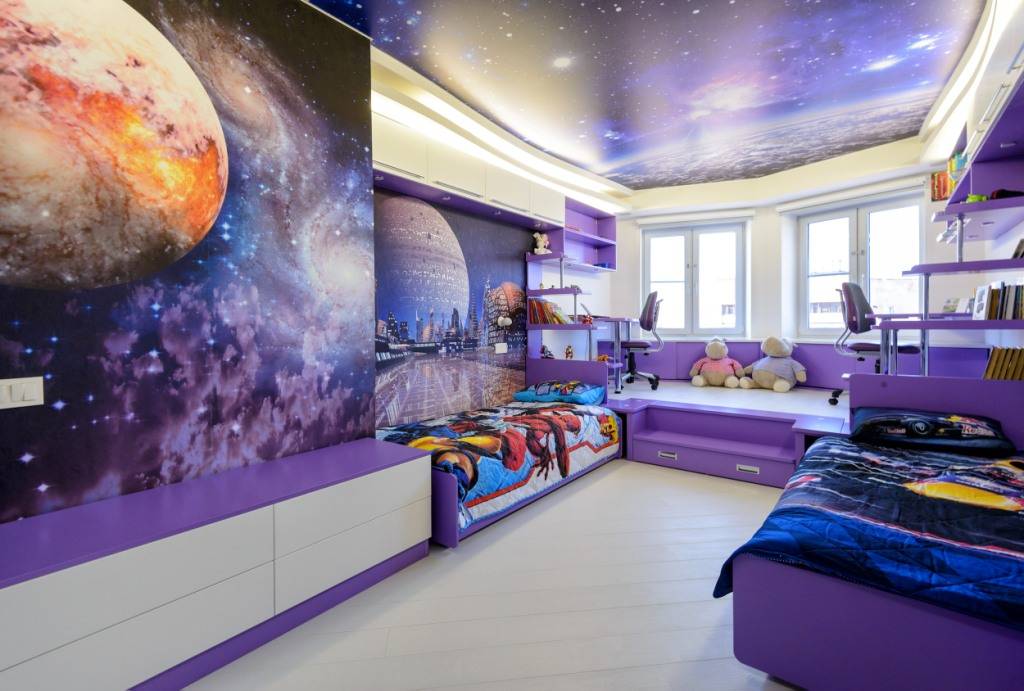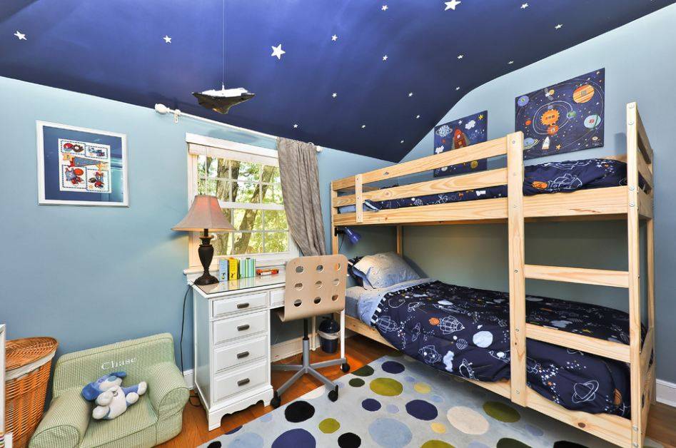 Поэтому ребенку, который обожает космос и все, что с ним связано, будет приятно оказаться в центре звездного неба или межгалактического корабля — именно в такой стилистике можно оформить детскую комнату.