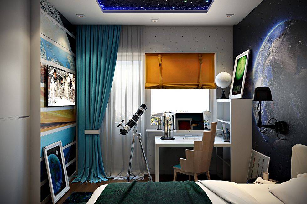 Интересное решение — комбинация обоев. Например, стена около кровати окрашена в темно-синий цвет и декорирована рисунками, а около рабочего стола стена сделана светлой. Оригинально выглядят флуоресцентные обои, которые светятся в темное время суток, заменяя ночник.