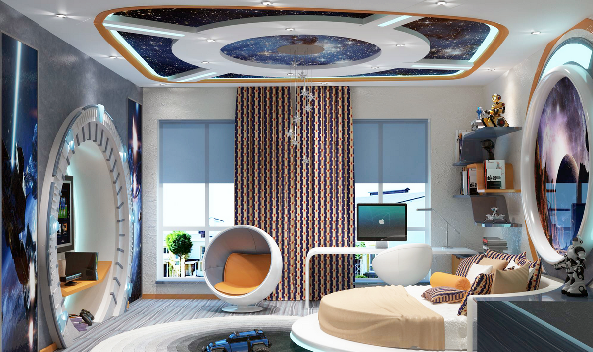 Достаточно сделать стилизованный потолок и пол, подобрать правильное оформление стен, выбрать подходящую мебель, добавить немного аксессуаров и текстиля — и комната превратится в домик звездочета, космический транспорт или даже инопланетное обиталище.