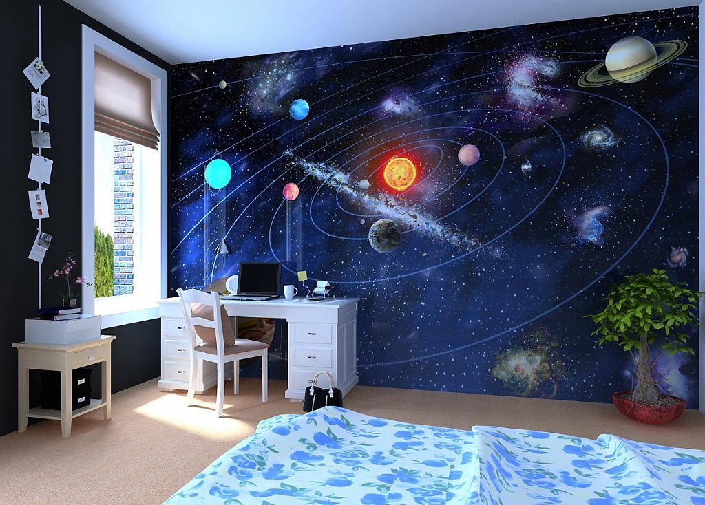 - Фотообои. Самый простой и беспроигрышный вариант. Космические сюжеты с планетами, инопланетянами, ракетами, звездными скоплениями украсят комнату, однако необходимо соблюдать пропорциональность размера рисунка и габаритов детской.