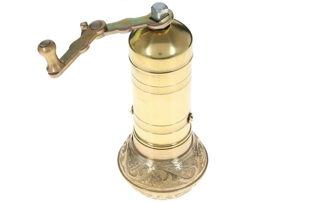 Выбирая ручную кофемолку, нельзя не обратить внимания на эту интересную модель. Она имеет сферическую ёмкость для зёрен. Дизайн очень оригинальный — тиснение на латуни. Нельзя не задуматься, сколько кофемолка прошла веков, чтобы попасть на кухню. Складывается впечатление, что она побывала в нескольких караванах, была в руках бедуинов. Она имеет чугунные жернова, уровень помола регулируется очень просто, с помощью шестерёнки и пружины.