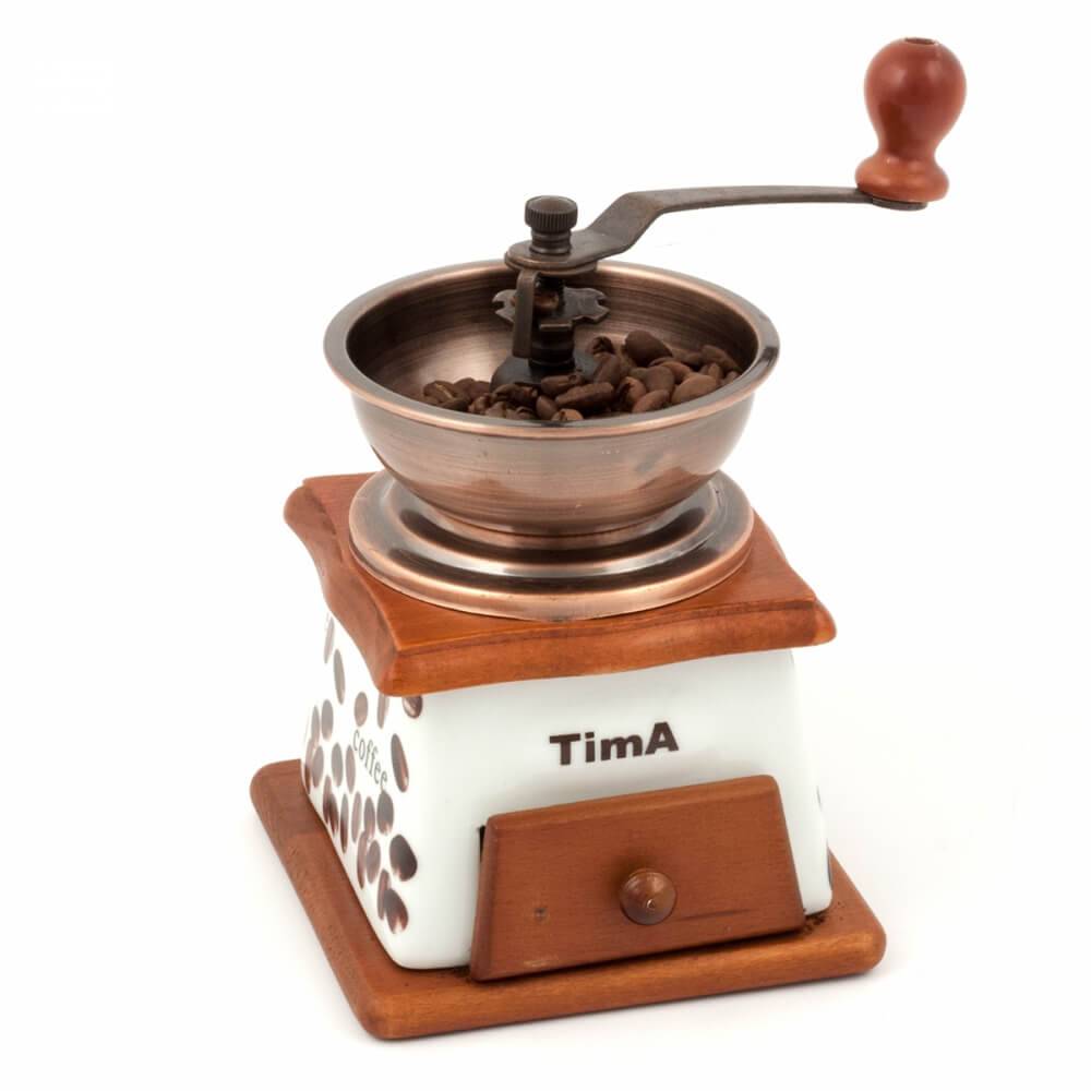 Tima — ручная кофемолка классического типа. Она выглядит достаточно мило, но не подойдёт для кухни в современном стиле. Мельница оформлена рисунком зёрен на белом фоне. Степень помола не регулируется, ручка вертикального расположения. В рейтинг лучших моделей она входит из-за соотношения цена/качество. Мельница достаточно бюджетна, но при правильном уходе прослужит очень долго.