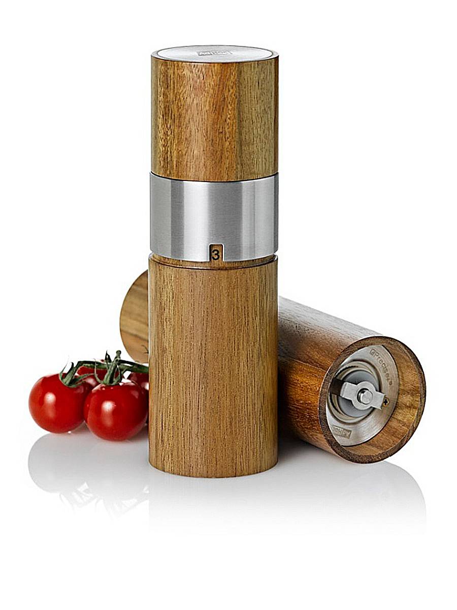Швейцарская фирма BodumTwin, знаменитая созданием френч-пресса для заваривания чая, имеет в своей коллекции мельницу, способную перемалывать одновременно соль и перец. Крышка в это же время является и переключателем между специями. Корпус мельницы выполняется из стекла или стали, а жернова – из керамики.