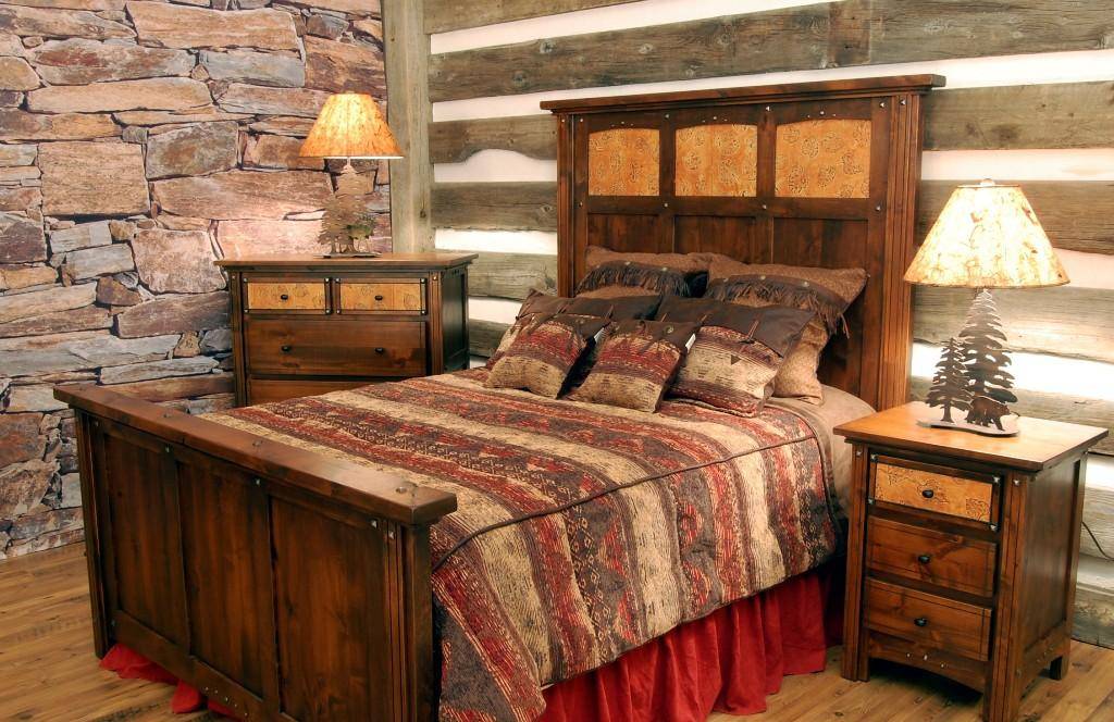 Спальня — это место уединения и тишины. Атмосфера помещения должна располагать к отдыху. Цветовая палитра преимущественно в теплых тонах. Потолок с открытыми балками и стены, имитирующие сруб на несколько тонов светлее пола. Центральное место в комнате занимает кровать. По возможности ее выполняют из массива, украшая изголовье коваными элементами (фигурки лесных жителей или цветочные мотивы). Спинка кровати должна гармонировать с прикроватными светильниками, декоративными подушками и покрывалом. Главный источник освещения устанавливают на прикроватные столики, в качестве декоративных элементов подойдут деревянные подсвечники, шерстяные пледы или картины с изображениями природы.