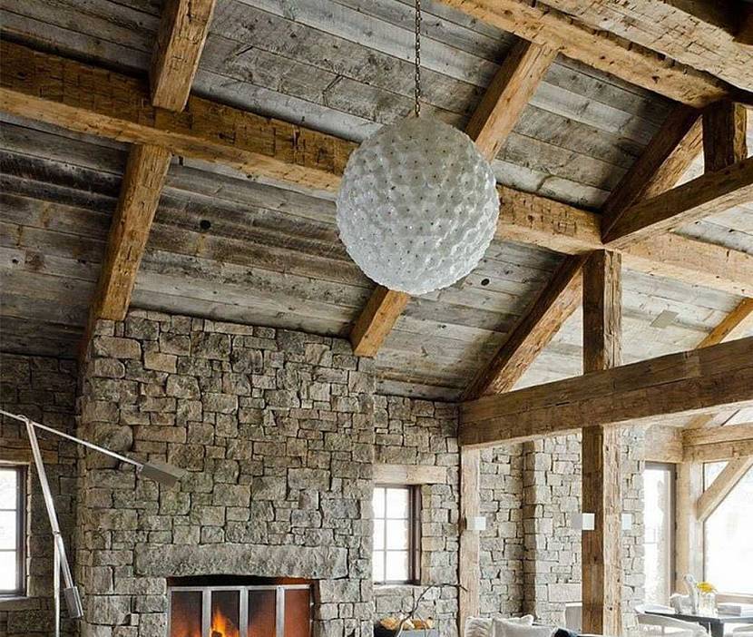 Наиболее простым материалом для облицовки является штукатурка. Желательно отдавать свой выбор фактурным видам, небольшая рельефность стен будет очень в тему. Для дополнительного декора допустимо использовать натуральный камень, только устанавливать его следует в меру, поскольку большое количество грубого камня сможет сделать жилище слишком мрачным. Подменить дорогой и непростой в работе натуральный камень при надобности можно похожей по внешнему облику керамической плиткой. Напольное покрытие обязано гармонировать с настенным. Оптимальным предпочтением станет паркетная доска. Она придаст дому изысканности и подчеркнет его простоту. Наиболее сложной станет облицовка потолка, поскольку рустикальный интерьер требует установку потолочных балок. Балки могут быть как из настоящего дерева, так и бутафорными. Первостепенное, чтобы потолок не получился излишне приземистым и сохранилось достаточно места между ним и полом.