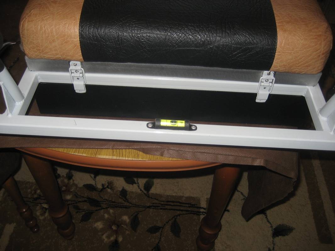 - Стул-ящик. Самая простая конструкция состоит из тумбы, определенной высоты (порядка 40 см), сверху которой смонтировано мягкое сидение. Оно служит так же в качестве верхней крышки тумбы и имеет свойство открываться. Внутри тумбы хранятся рыболовные принадлежности, а также рыба.