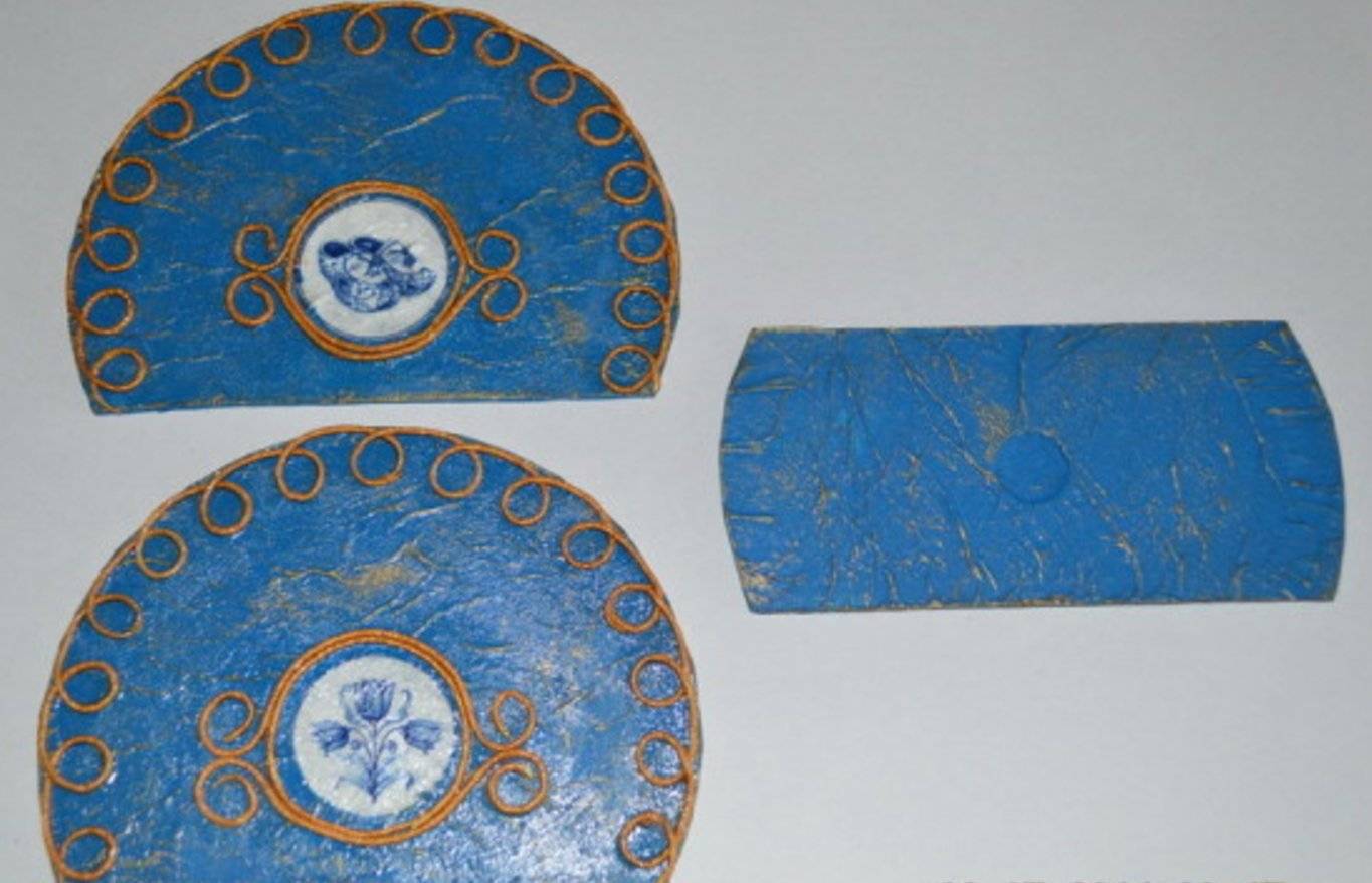 Из цветной салфетки для декупажа следует вырезать два рисунка и наклеить их на центральные участки заготовок акриловым лаком.