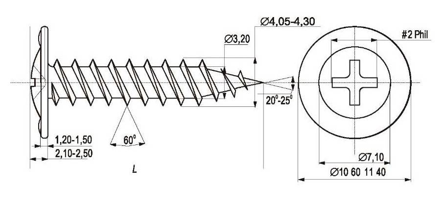 | Обозн. | L длина, мм | Диам. головки, мм | Диам. пресс- шайбы, мм | Внутр. диаметр основания, мм | Внешний диаметр основания, мм | Длина сверла, мм | Диам. сверла, мм | Вес 1000 шт., кг |