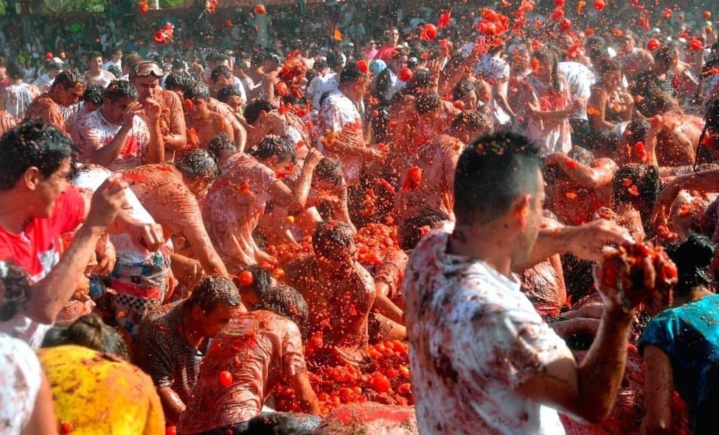 Битва снежками – прошлый век. В Испании для этих целей применяют помидоры! На празднике Томатина, который там проводят каждый август, собираются тысячи людей, чтобы поучаствовать в битве томатами. Овощи привозят на повозках и все участники действия закидывают друг друга в течение часа, превращая все вокруг в красную жижу. Всего в битве используют примерно 15 т помидоров!