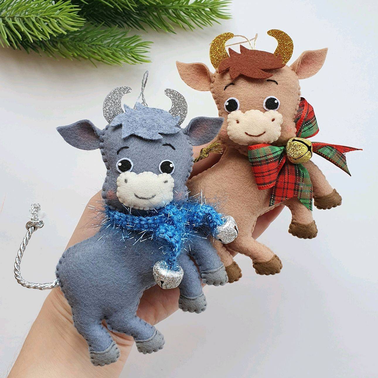 Итак, в 2021-м году будет год Быка, а именно белого металлического. Потому на елке должен присутствовать символ года. Эта коровка будет изготовлена из ткани, чтобы она вышла объемной, следует наполнить ее ватином. Для изготовления животного потребуется сделать выкройку, которая представлена выше, она состоит из туловища (двух деталей), головы (двух деталей), хвоста (2 детали), мордочки, головы (2 детали), ушей и рожек, вымя можно и не делать. Цвета желательно использовать белые серебристые.