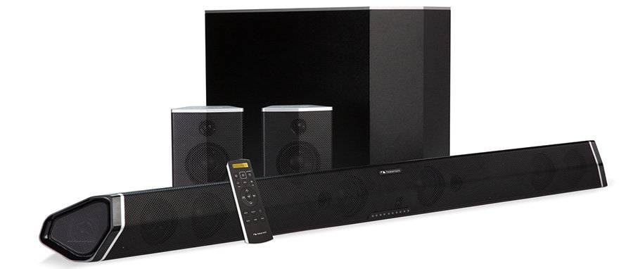 Это устройство для тех пользователей, которые не могут решить, что выбрать – саундбар или домашний кинотеатр. Техника состоит из трехканального саундбара, двух напольных тыловых колонок и сабвуфера, вместе обеспечивающих отличный объемный звук. Общая мощность – 1000 Вт.
