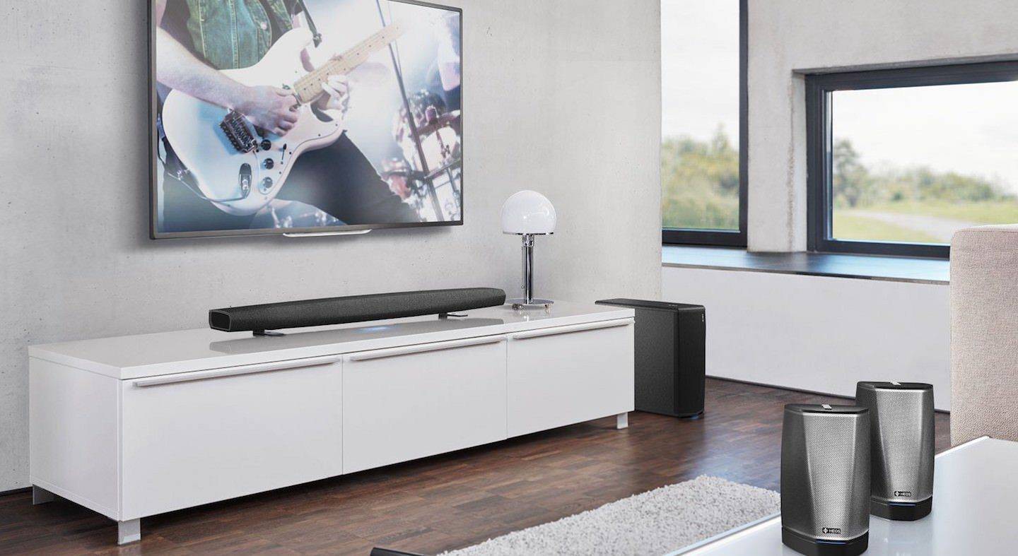 Мультирумный саундбар Heos Bar в паре с Heos Subwoofer, дополненный колонками Heos 1
