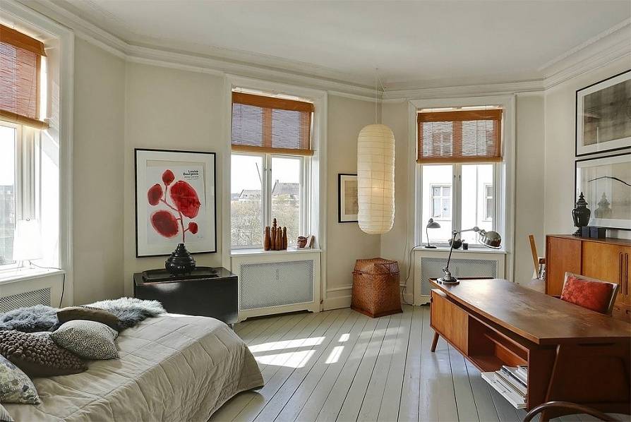 Для маленькой квартиры отлично подойдет кровать-подиум в скандинавском стиле. Внутреннее пространство подиума может выполнять роль комода или полочек, в которых можно хранить бытовые приборы, одежду или книги. В интерьере скандинавского стиля обычно присутствует минимум декора. Изюминка данного стиля – яркие акценты. Это могут быть коврики, картины, подушки или постеры в скандинавском стиле. Зеркала тоже будут кстати. Они наполнят квартиру солнечным светом и визуально увеличат пространство. Текстиль, свечи, фарфор – все это будет гармонично смотреться в интерьере.