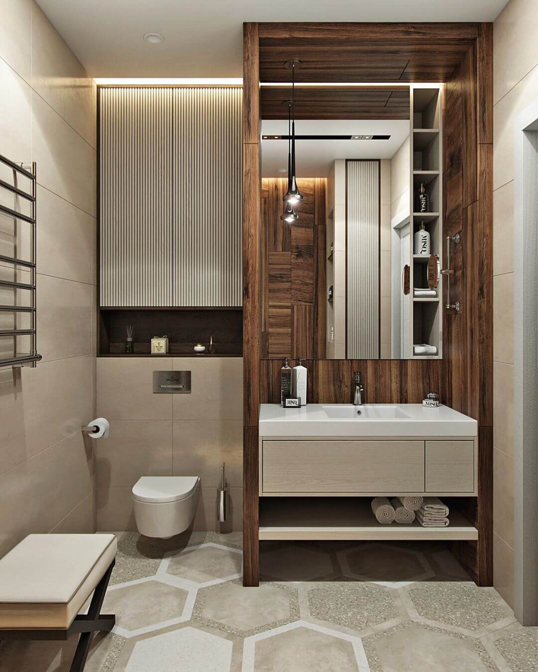 Без натурального дерева в ванной комнате в скандинавском стиле, как и в других помещениях, не обойтись: короб для раковины, шкафчики, полочки, аксессуары, даже стульчак от унитаза – дерево смягчит белизну отделки, не позволив превратить санузел в скандинавском стиле в стерильную палату.