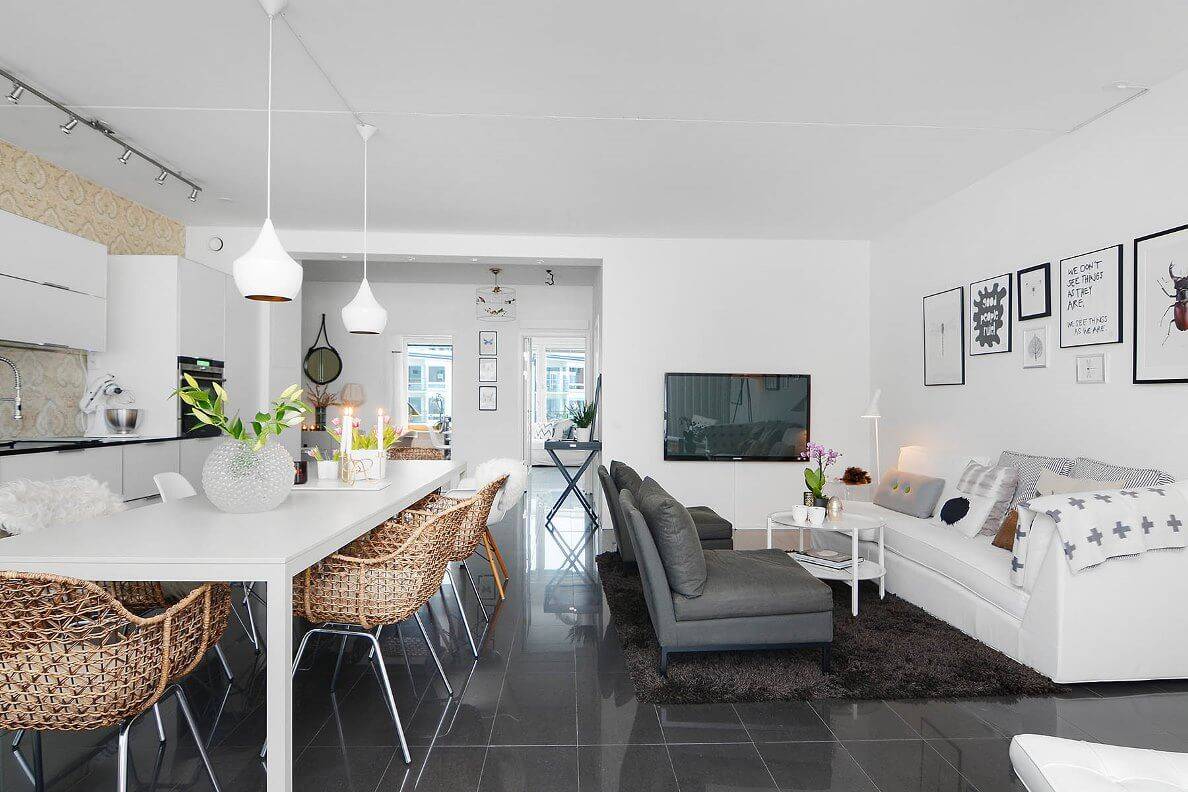 Фото 1. Основной цвет в интерьере скандинавской кухни-гостиной – белый. Он дополнен светлым деревом на полу. Роль декоративного акцента отведена текстильным элементам.