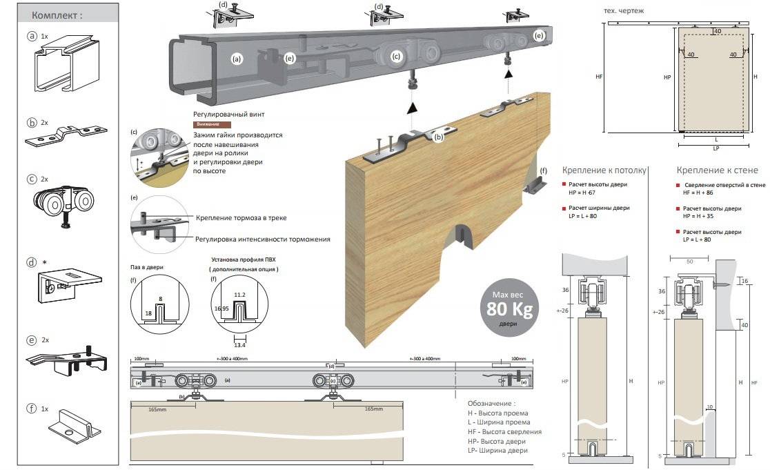 Под дверями купе подразумевается раздвижная конструкция, где одна часть заходит на другую при открытии. Для монтажа системы нужна следующая фурнитура: