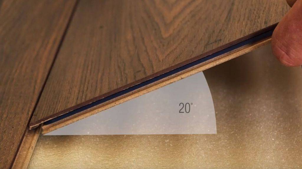 Панель вставляется под углом 20 градусов в паз предыдущего ряда, а затем осторожно кладется на пол