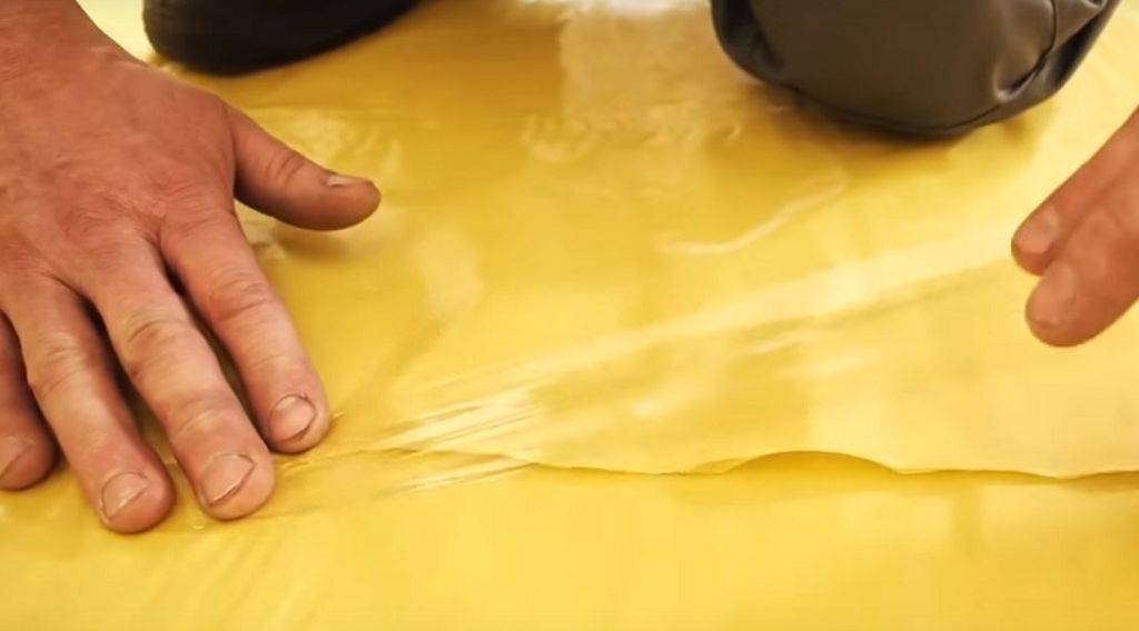 Шаг 2. Чтобы пол был защищен от влаги, он застилается пароизоляционной пленкой. Материал обязательно подворачивается на стены на высоту плинтуса. Излишки у стен обрезаются.