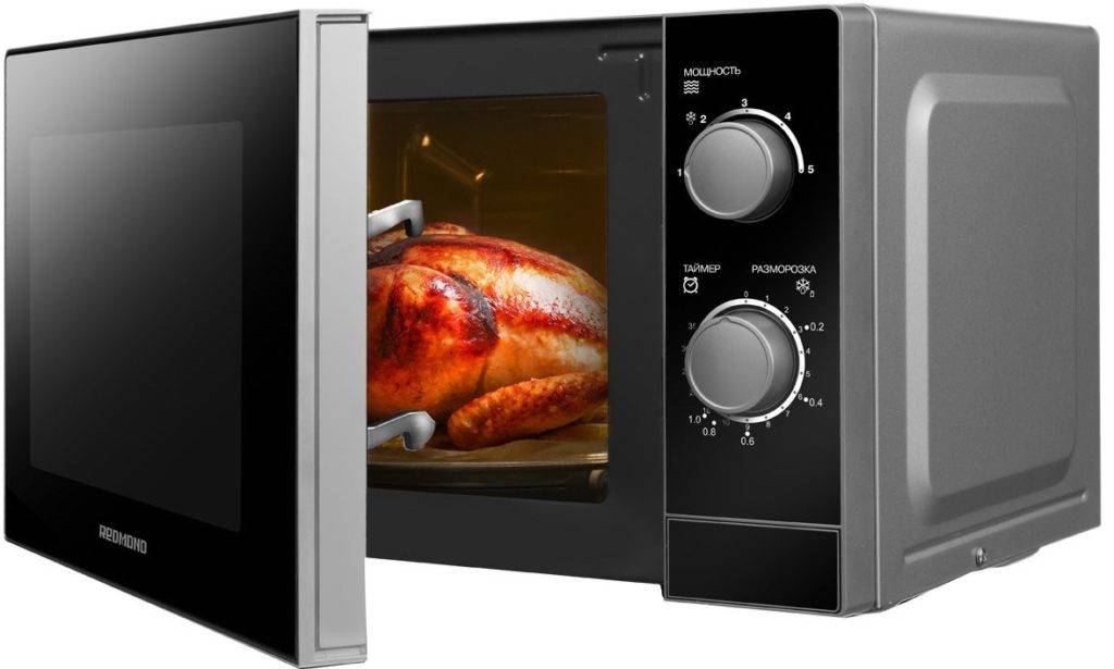 Есть таймер на полчаса и подсветка внутри камеры, управление – механика. Но учтите, что объём здесь 18 литров, чего достаточно на одного, максимум на двух человек. Покрытие камеры жаропрочная эмаль, есть шесть уровней мощности. Отсутствует защита от детей, автопрограмм и гриля также нет.