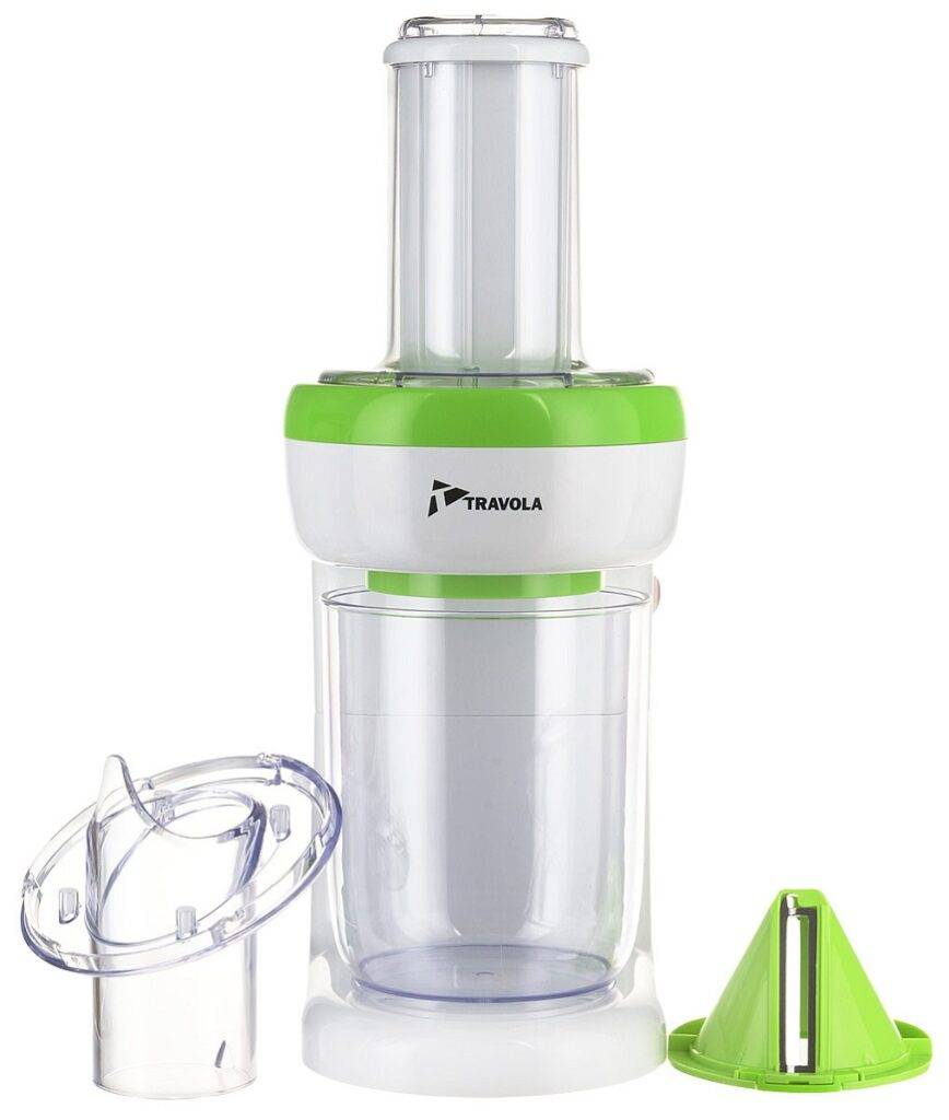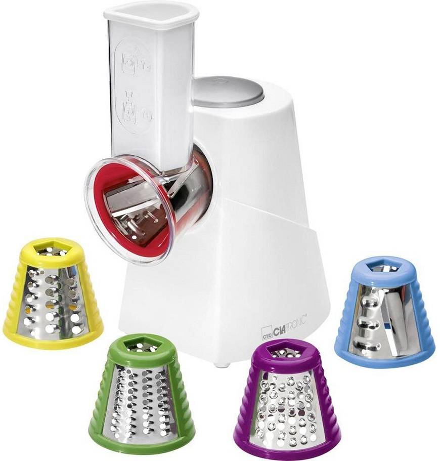 Мультирезка с 220-ваттным мотором стоимостью около 5,5 тыс. руб. может обрабатывать даже твердые овощи. Мелкая терка позволяет получить из шоколада тонкую и напоминающую молотый кофе пыль, а из сыра — паутинку. Вторая насадка обеспечивает ломтики, третья — мелкую шинковку. Однако мягкие продукты измельчаются в ней неравномерно, а максимальное рекомендованное время работы — всего 5 минут подряд.